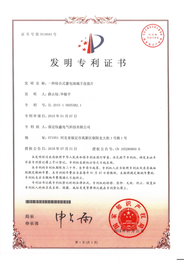 发明名称:一种组合式蓄电池端子连接片,专利号:ZL 2015 1 0005382.1,专利申请日:2015年01月07日,专利权人:保定钰鑫…